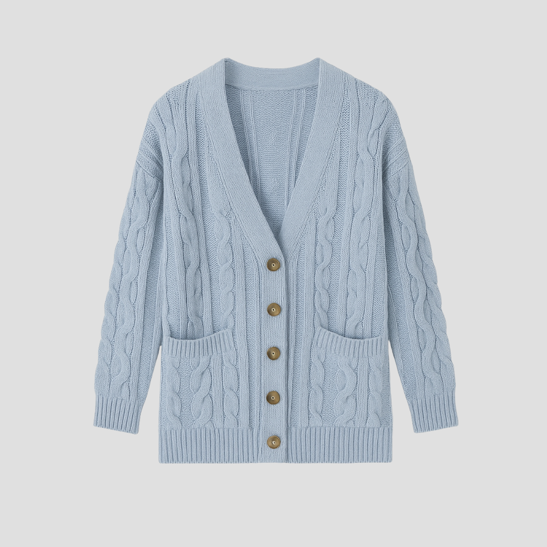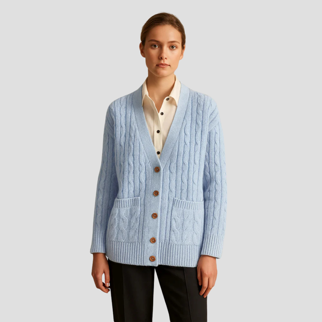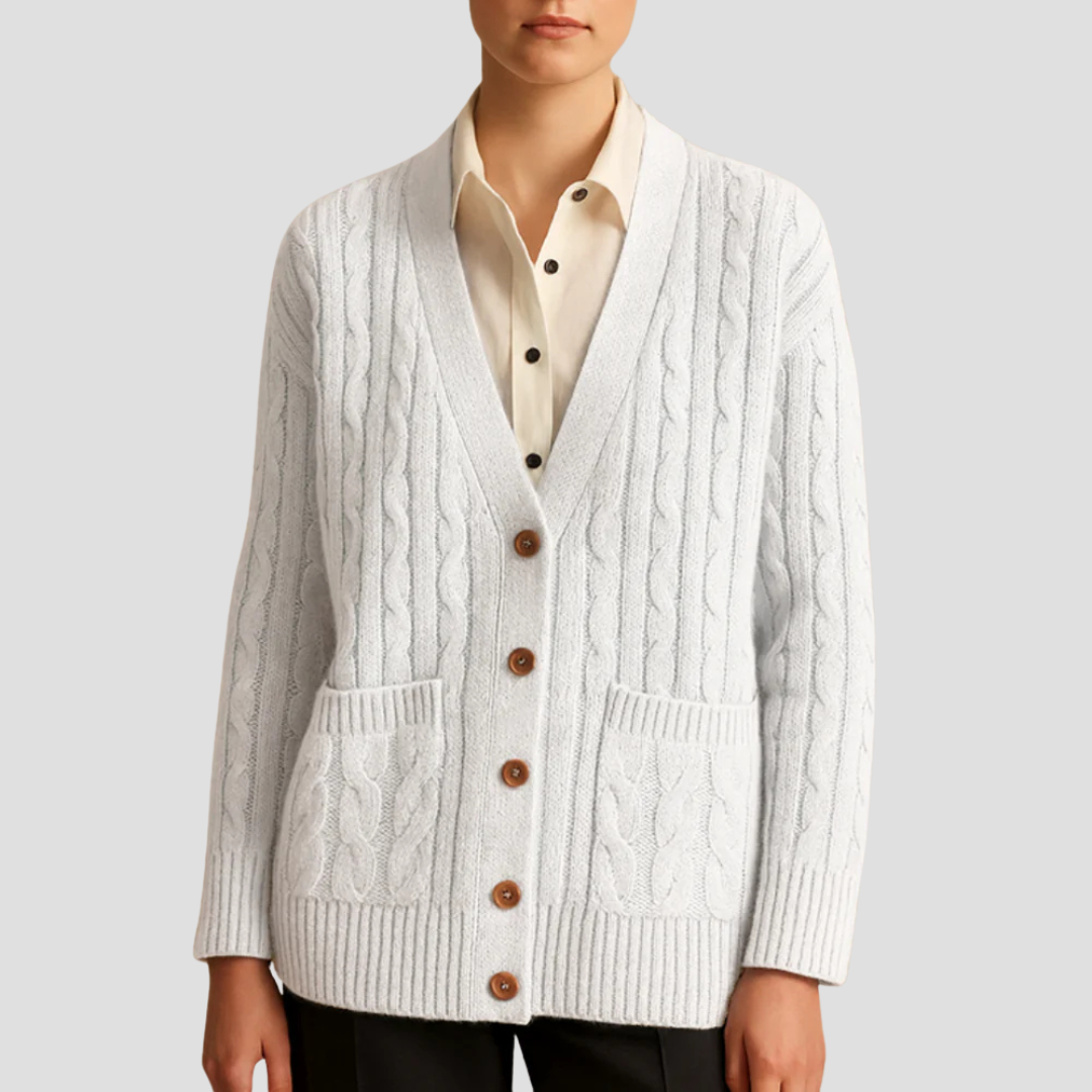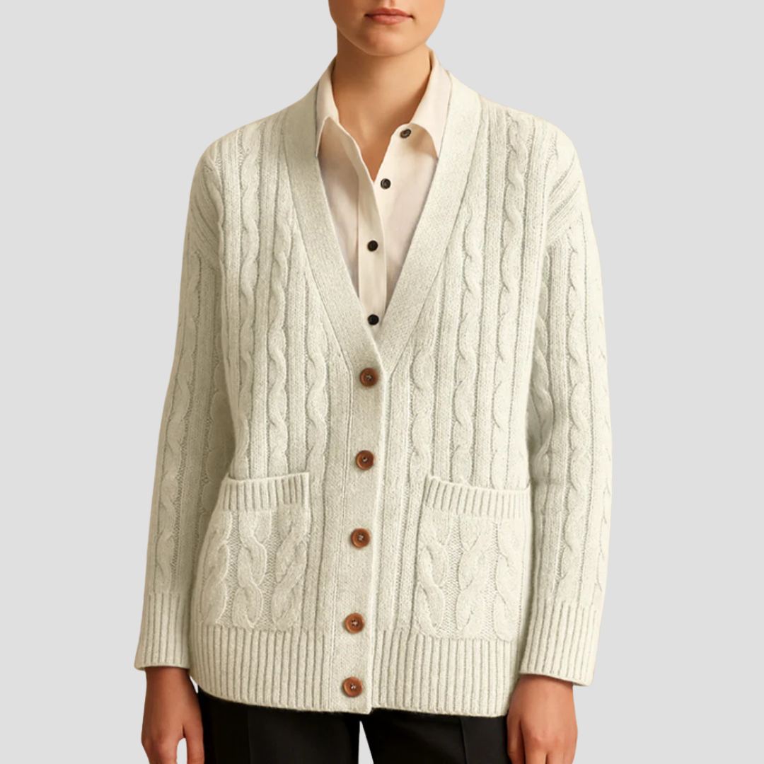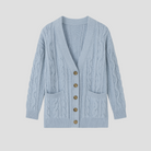 This Laurevain women’s cardigan is crafted from soft polyester in a long, relaxed shape, offering warmth and comfort for cooler days. The cable knit texture and button closure bring an understated charm, making it a versatile piece for layering.