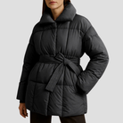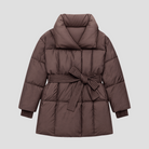 The Laurevain belted puffer jacket is designed to combine modern elegance with practical warmth. Featuring a voluminous wrap collar, quilted construction, and insulating fill, it delivers reliable cold-weather protection. The adjustable waist belt cinches the silhouette for a flattering fit, while side pockets enhance everyday convenience and function.