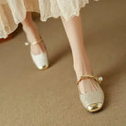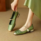 Vintage glamour meets modern grace in these elegant low-heeled pumps. Wrapped in a soft silk-like vegan finish and accented with a twisted pearl strap, they’re completed with an embellished square heel — perfect for evenings, weddings, or refined daytime looks.